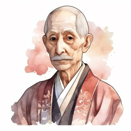 Watercolor portrait of a Japanese senior man in traditional kimono