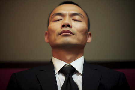 Japanese man prays to god on dark studio background. Cinematic effect
