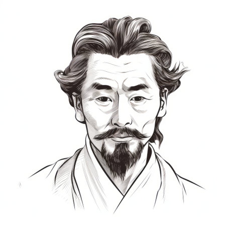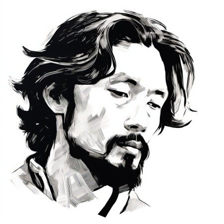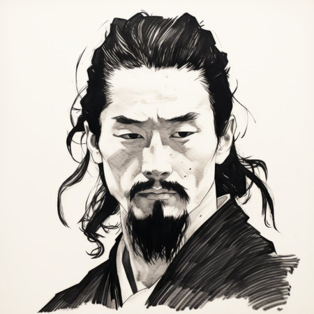 a stunning illustration captures the essence of a captivating man with long dark hair and beard. inspired by contemporary asian art, this black and white masterpiece showcases brushstroke-intensive portraits. with a resolution of 20 megapixels, this illustration is a true work of art, worthy of being featured in the associated press photo collection. ai generated