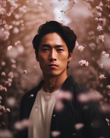 Portrait of handsome young asian man in blooming garden.