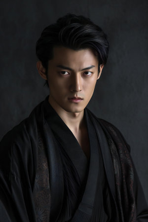 Portrait of young man in kimono looking at camera.