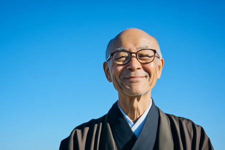 Senior Japanese man with glasses, smiling kindly, showing his wisdom and friendly demeanor, standing against a calm sky-blue background, evoking feelings of serenity.