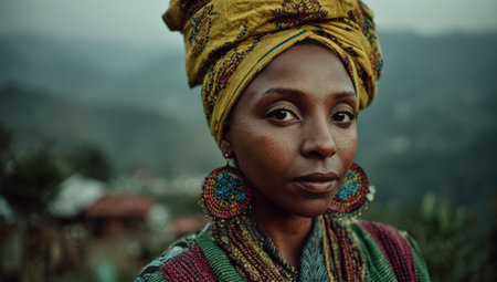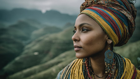 Woman in vibrant traditional clothing gazes into the distance, with large earrings and a colorful headwrap, set against a backdrop of rolling green hills and a moody sky