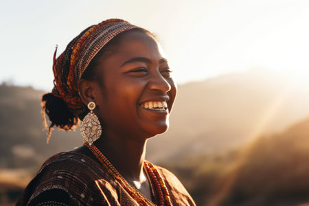 an ethnic woman facing the sun and smiling, created with generative ai