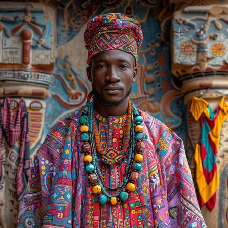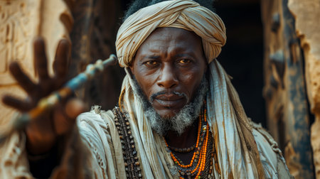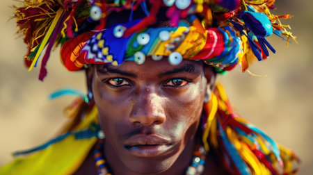 Portrait of an African man dressed in traditional ceremonial garb, complete with cultural ornaments and accessories. He proudly holds a tribal feathered staff, symbolizing cultural heritage and identity