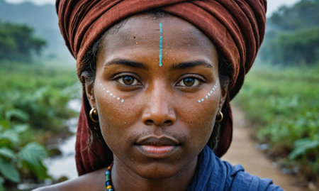 A young woman with traditional facial markings stares directly at the camera, wearing a red headscarf and blue clothing in a rural setting