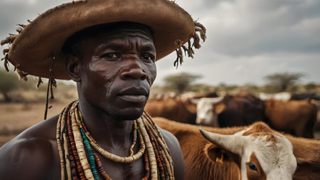 Portrait of people living in Africa, Namibia, dry desert, cows, tribal living, made with Generative AI