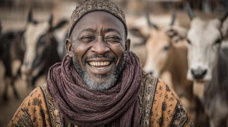 African cattle farmer is sitting for a portrait in front of his large herd of cattle