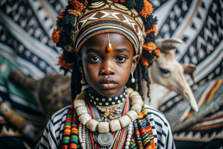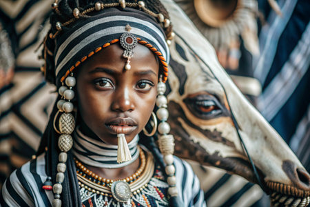 A beautiful black African girl in a traditional African national costume. Against the background of a zebra. The portrait symbolizes the traditions and beauty of the African people.