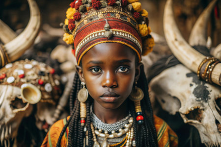 A beautiful black African girl in a traditional African national costume. Against the background of bones. The portrait symbolizes the traditions, culture and beauty of the African people.