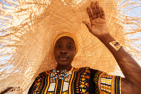 Low angle fashion portrait of Black young woman wearing giant straw hat and looking at camera in sunlight, copy space