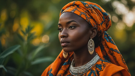Beautiful african woman in traditional clothing and headscarf at sunset
