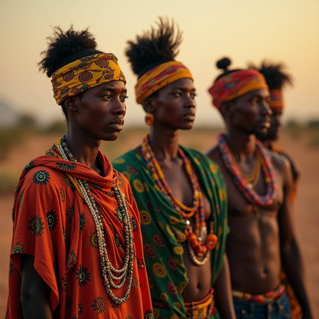 A close-up portrait of three african individuals dressed in vibrant ethnic clothing.