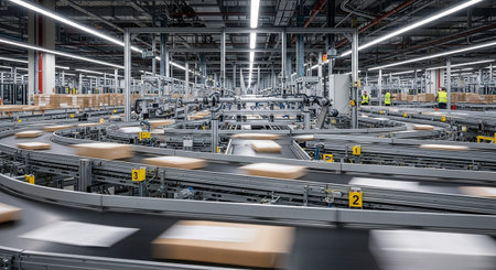 A vibrant view of a busy distribution center featuring multiple conveyor belts and efficient operations within a large warehouse. The image captures the movement of goods and the hustle of logistics.