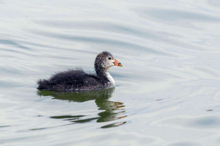A young European coot (Fulica atra) swims in a pond. At this age, the chick is often separated from its parents.