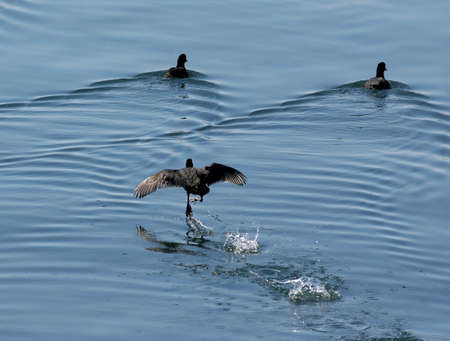 A flock of American Coot water birds flapping their wings at the surface of the water.