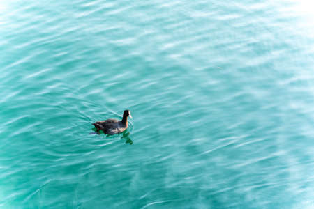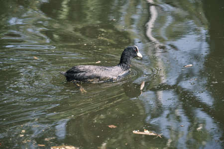 A common coot - Fulica atra - swim in the water on a sunny day in springtime. Saint Petersburg, Russia.