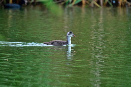 A juvenile Eurasian coot (Fulica atra) swimming in a freshwater pond in the middle of June.