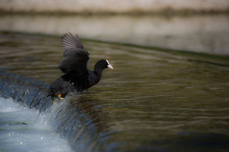 Fulica atra on a river (Fulica atra) is a migratory waterfowl in the rally family.