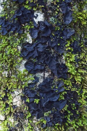 lichen on a branch with dark green mosses, lichen growing on board. Abstract organic photo.