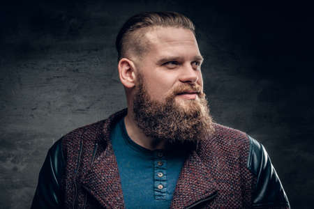 Portrait of fat bearded male dressed in a jacket.