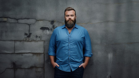 Irresistible man Confident young bearded man in blue jeans shirt looking away and keeping arms crossed while standing against wall : Generative AI