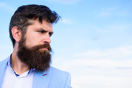 Man bearded hipster with mustache blue sky background. Ultimate mustache grooming guide. Expert tips for growing and maintaining mustache. Hipster serious handsome attractive guy with long beard