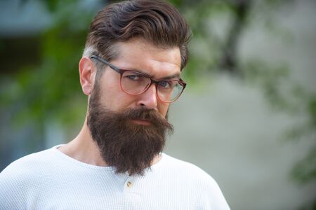 Bearded businessman face portrait outdoor, copy space. Bearded man wearing street style. Businessman in the city. City street with business man. Man style. Stylish man in casual business style