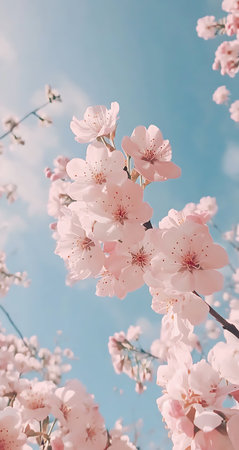 Soft pink petals adorn branching cherry blossoms, creating a beautiful canopy in early spring.