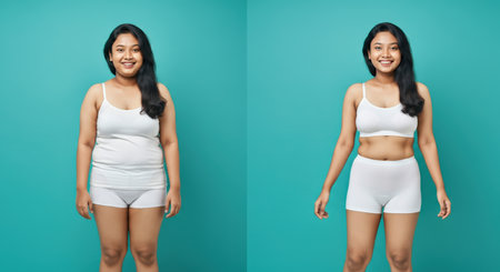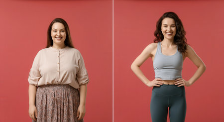 Transformational fitness journey of caucasian female adult in activewear before and after