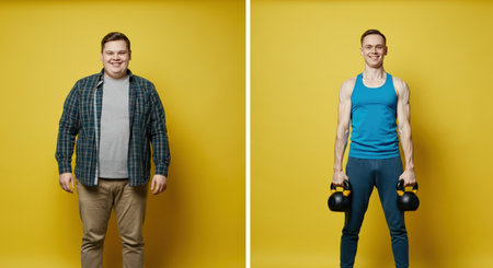 Contrast of fitness journey young caucasian males holding kettlebells against yellow background