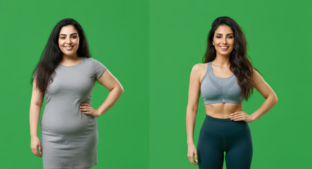 Transformation journey of young middle eastern female on green background for fitness inspiration