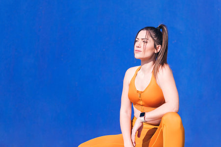 Transformation journey of asian female adult from casual attire to fitness apparel on pastel background