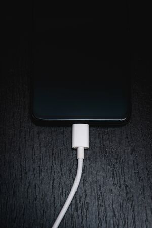 new smartphone with a black screen with a white wire from the charger on a gray background top view close-up, black and white photo with a vignette