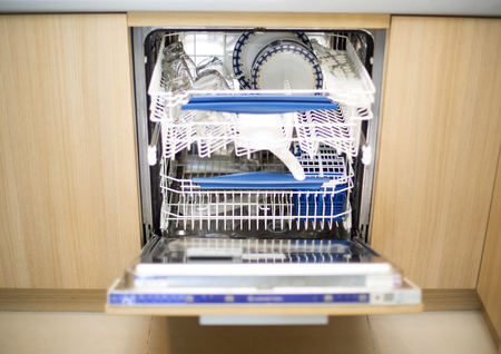 Open door of built-in dishwasher with clean plates and dishes at kitchen. Housework