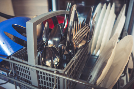 Dishwasher with clean utensils in modern kitchen interior.