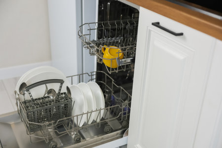 Modern kitchen dishwasher with white dishes for electronic washing device in stylish setting