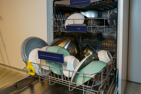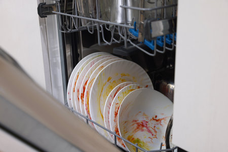 Modern kitchen interior with white dishes ready to be washed in electronic dishwasher appliance