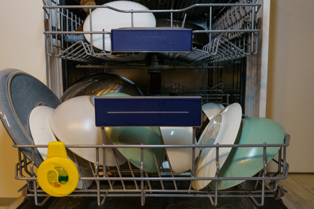 filled with different dishes, spoons, forks dishwasher. colorful Dishware inside built-in dishwasher.