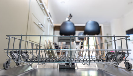 Close-up view of an open empty automatic dishwasher in kitchen. Modern kitchen appliance. Housekeeping equipment, Household chores.