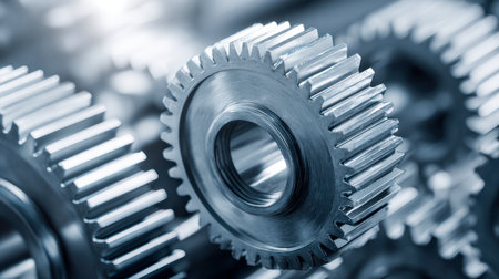 Intricate metal cogwheels reveal meticulously crafted teeth showcasing industrial engineering and precise mechanical movement.