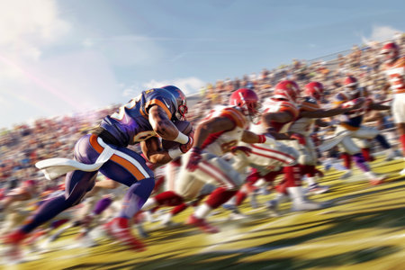 Group of American football players sprinting across a field during a game, showcasing speed and determination.
