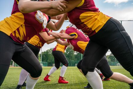 Close-up of American football players gathered together in dark blue shirts. To discuss the principles and skills used in sports. strategic planning leadership