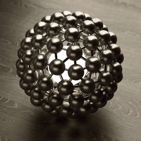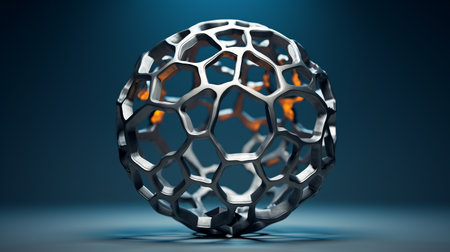 A metal ball crafted from interconnected pieces, forming a mesmerizing design, Design a mesmerizing arrangement of interconnected geometric shapes resembling a molecule structure