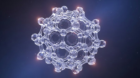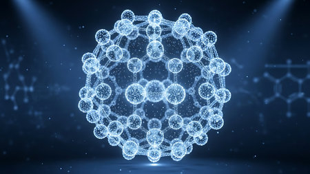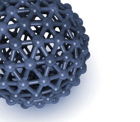 A detailed 3D rendering of a complex molecular structure composed of interconnected light blue spheres, showcasing a scientific and technological theme.