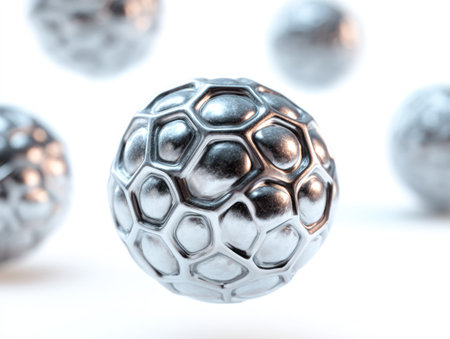 Several metallic spheres are displayed against a clean white backdrop. Each sphere exhibits a distinctive hexagonal pattern, with a polished, reflective surface. The composition utilizes shallow depth of field, resulting in a blurred background that enhances the focus on the central subject. This image may be suitable for illustrating technology, design, or conceptual themes.