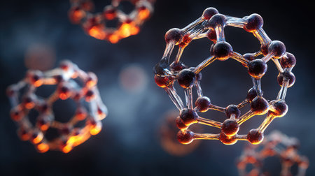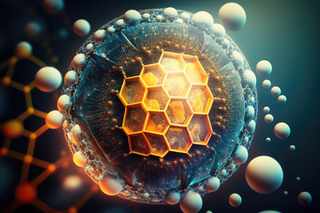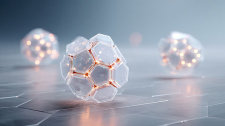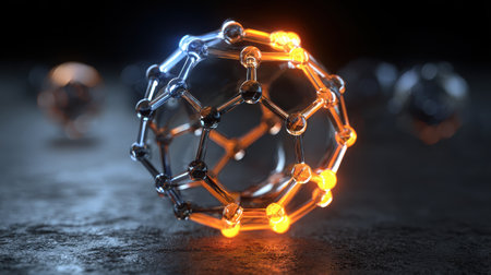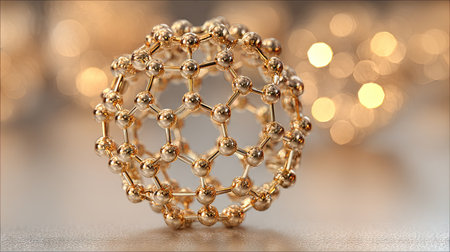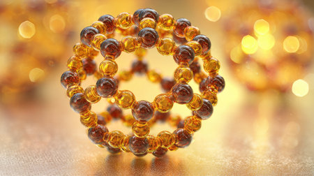 A close-up showcases a spherical molecular structure constructed from interconnected amber and brown spheres. The composition features blurred background lights, contributing to a warm, golden ambiance. Its design suggests scientific or technological applications, suitable for various commercial purposes.