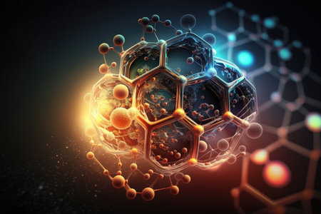 This captivating digital artwork illustrates a molecular structure with glowing atoms, set against a dark background, highlighting the beauty of scientific concepts.