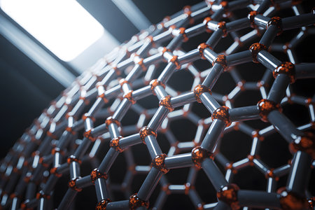 Close-up macro of a geometric carbon nanotube structure, featuring dark gray and black rings with glowing orange-red accents, sharp focus, and dramatic lighting.