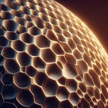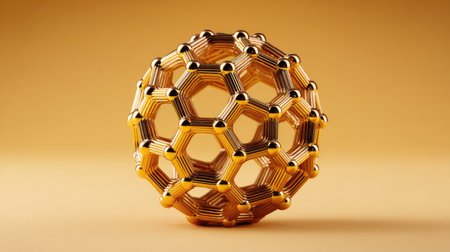 A detailed rendering showcases a complex geometric structure composed of interconnected hexagonal shapes. The design features a warm color palette with gold and bronze tones, enhanced by soft lighting. This versatile image is suitable for various commercial uses, including website design, advertising, and educational materials.